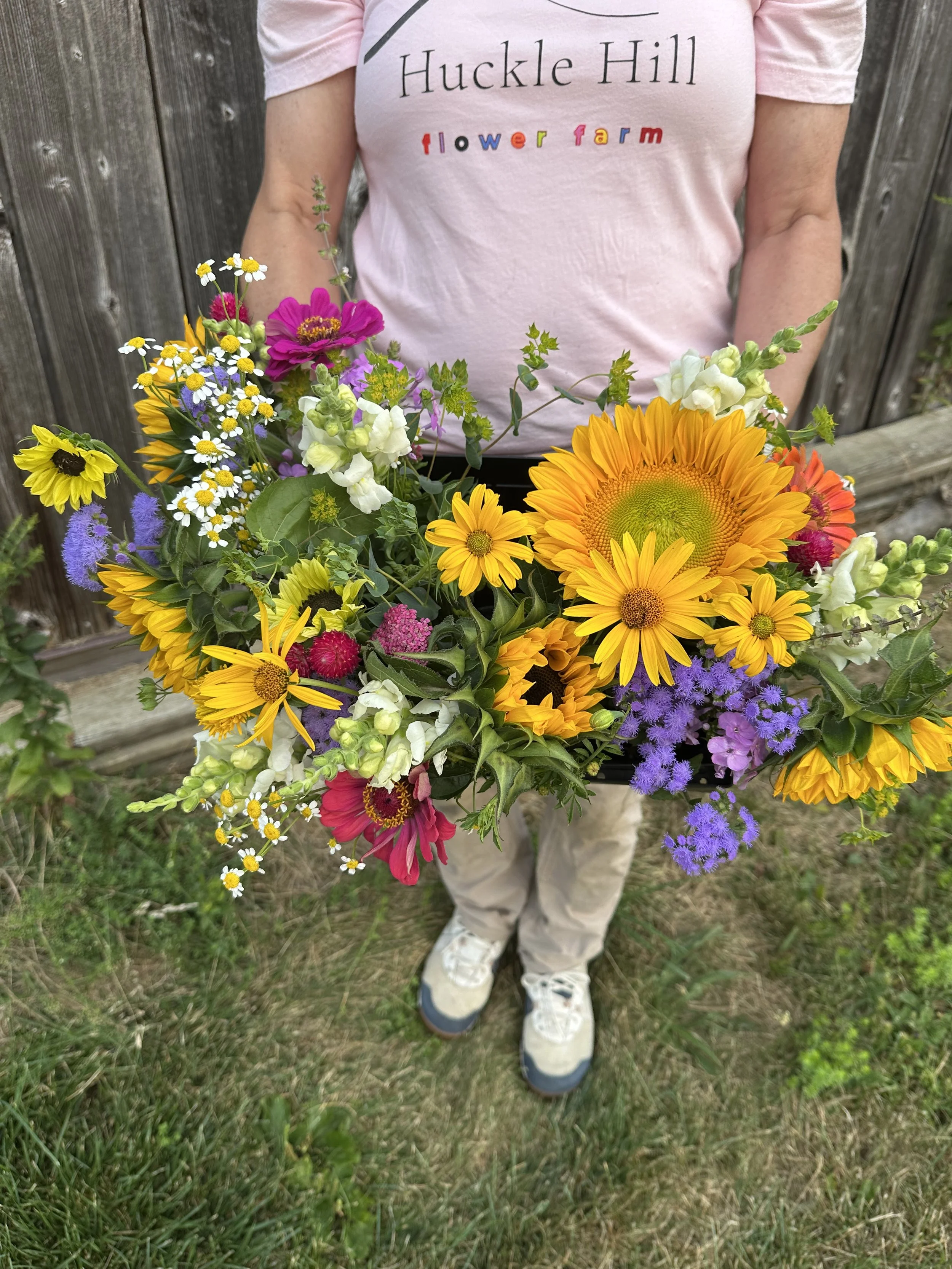 Bouquets may include sunny Sunflowers, bright Zinnias, unique filler blooms - a surprise each week!
